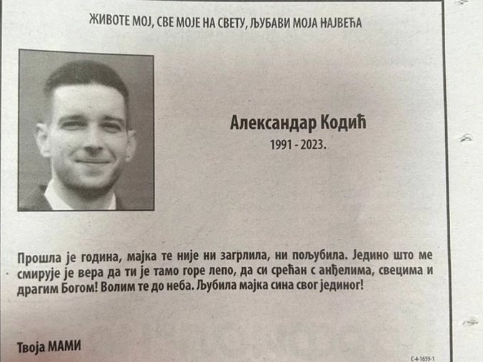 Proslavljeni harmonikaš, Mirko Kodić, otkrio je u emotivnoj ispovesti za medije kako se nosi sa gubitkom svog sina Aleksandra Kodića, koji je iznenada preminuo u snu pre godinu dana. Sada, uoči godišnjice Aleksandra Kodića, oglasila se i njegova majka, pa je u novinama uz njegovu sliku osvanula dirljiva poruka u kojoj je naglasila koliko joj fali.