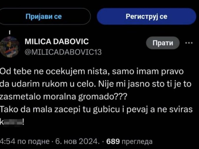 Ova objava izazvala je brojne reakcije korisnika platforme "X", među kojima je bio i komentar Milice Dabović, koja je postavila emotikone koji se lupaju u glavu.