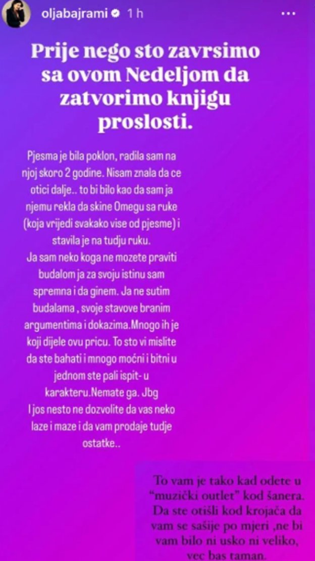 - Pesma je bila poklon, radila sam na njoj skoro dve godine. Nisam znala da će otići dalje. To bi bilo kao da sam ja njemu rekla da skine "omegu" sa ruke (koja vredi svakako više od pesme) i stavila je na tuđu ruku. Ja sam neko koga ne možete praviti budalom, za svoju istinu sam spremna i da ginem. Ja ne ćutim budalama, svoje stavove branim argumentima i dokazima. Mnogo ih je koji dele ovu priču. To što vi mislite da ste bahati i mnogo moćni i bitni u jednom ste pali ispit - u karakteru. Nemate ga. J****a. I još nešto, ne dozvolite da vas neko laže i maže i da vam prodaje tuđe ostatke - napisala je Bajramijeva.