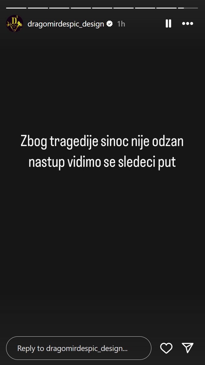 S tim u vezi, svoj nastup otkazao je i Dragomir Despić Desingerica, koji se rano jutros oglasio na svom instagram profilu, otkrivši da zbog tragedije u Zagrebu nije održao svoj unapred zakazan nastup.