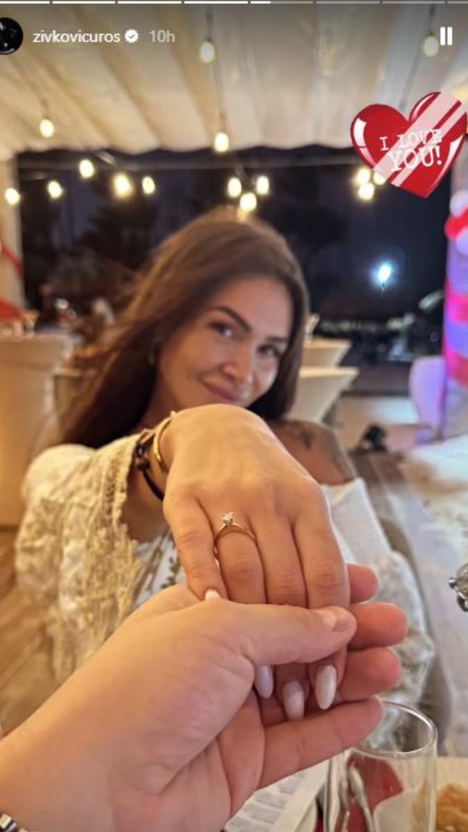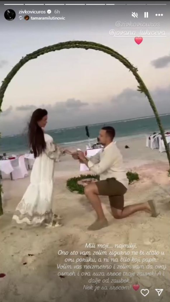 Uroš je podelio snimak na kom se vidi kako je svojoj izabranici stavio prsten na ruku. On je klekao ispred nje, a ona ga je oduševljeno gledala, a nakon sudbonosnog "da" pao je strasan poljubac, ali i suza radosnica.Brojne kolege odmah su čestitale folkeru na ovoj životnoj odluci, a među prvima su bile Tamara Milutinović i Katarina Grujić.