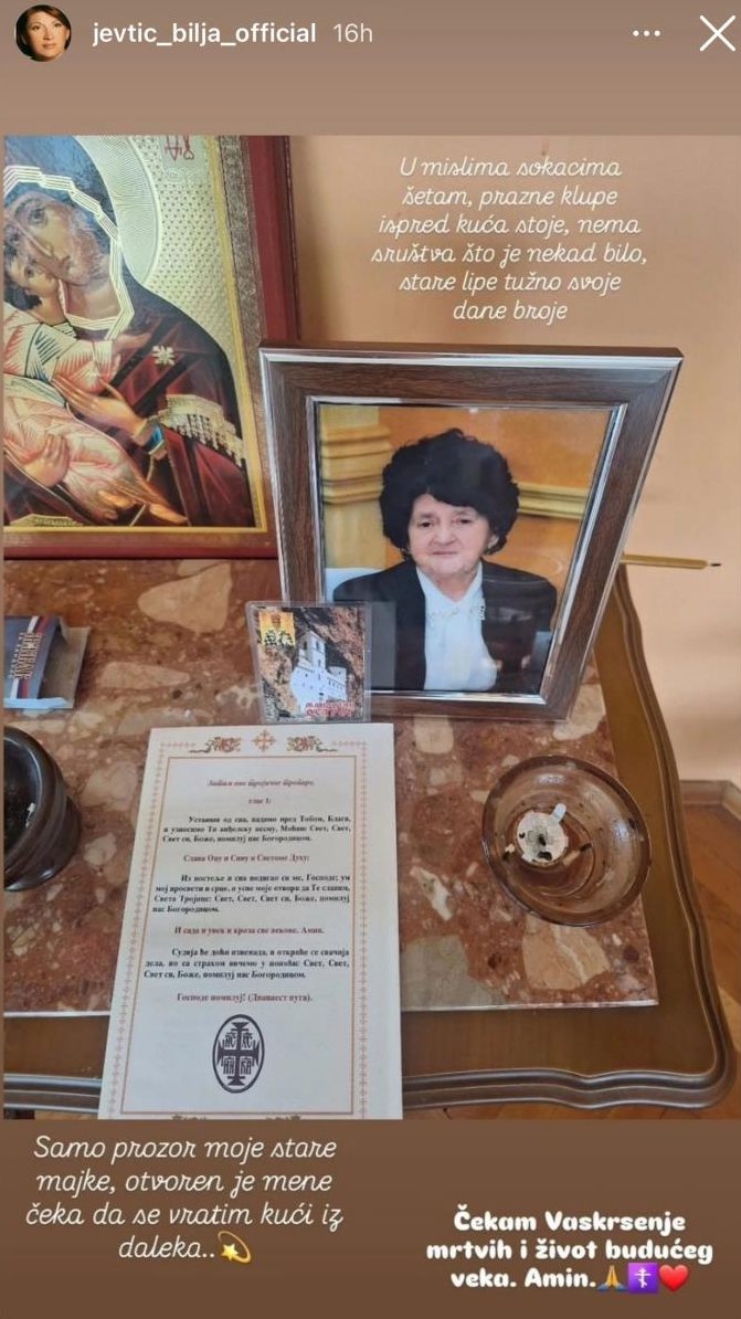 Folk pevačici Biljani Jevtić, početkom marta preminula je majka Dobrila. Ona se od tada nije pojavljivala u javnosti, ali je pred Vaskrs prekinula ćutnju i oglasila se na svom Instagramu.