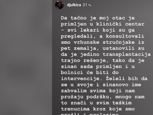 Da, tačno je, moje otac je primljen u Klinički centar. Svi lekari koji su ga pregledali, a konsultovali smo vrhunske stručnjake iz pet zemalja, ustanovili su da je jedino transplatacija trajno rešenje, tako da je Sinan sada primeljen u bolnicu gde će ostati do intervencije - napisala je Đulkica i dodala: