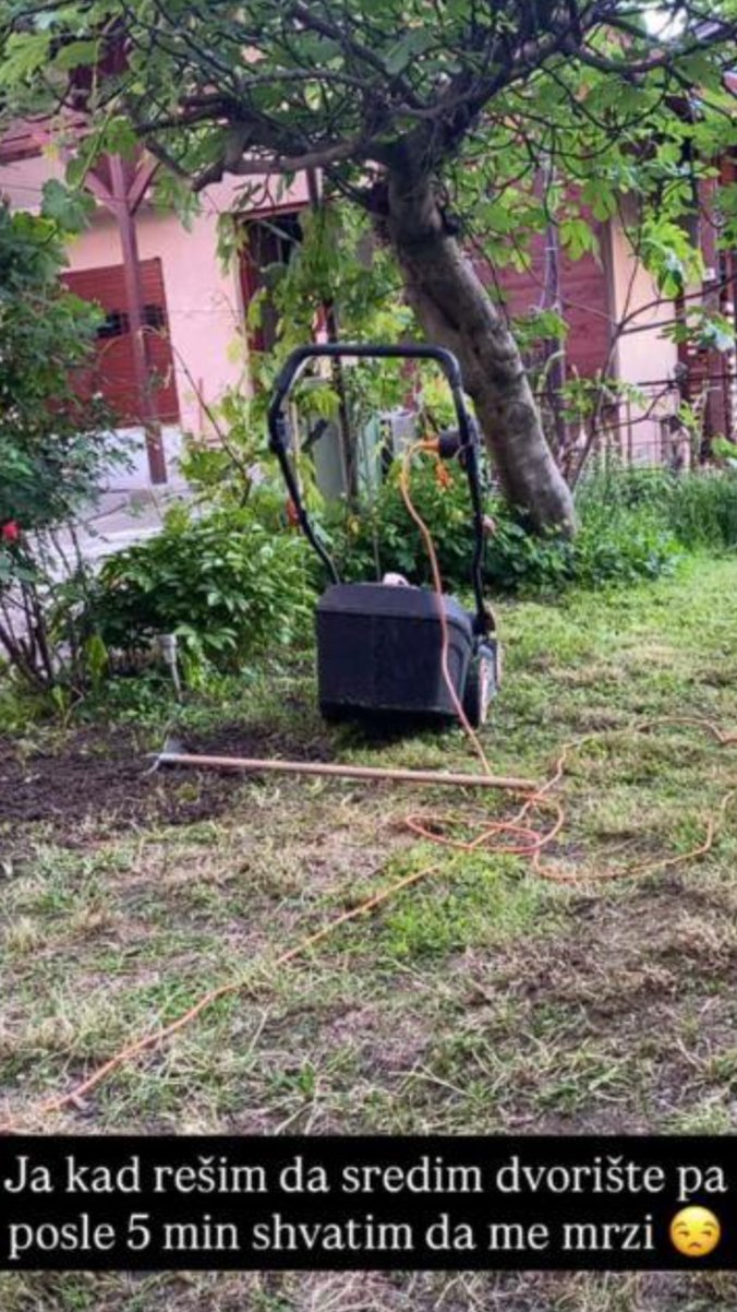 Naime, ona je uzela kosilicu i počela da kosi travu koja je porasla, pa je posle 5 minuta shvatila da je mrzi da to radi.