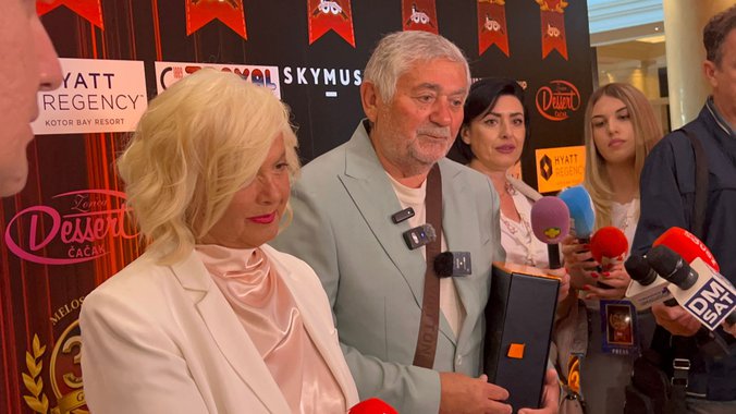 Pevač Radiša Urošević došao je večeras na proslavu 35 godina Melos Estrade u Beogradu, a društvo mu je pravila supruga sa kojom je 52 godine u braku.