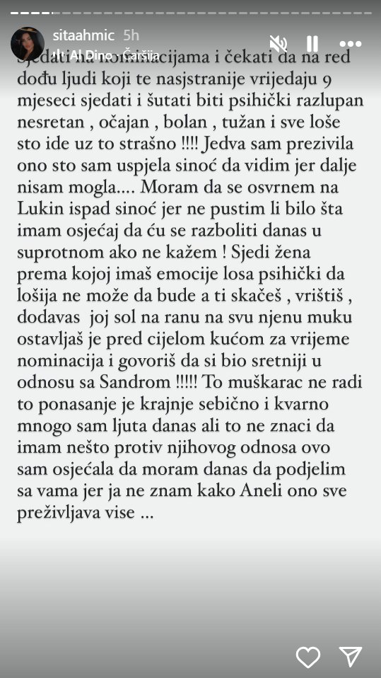 - Sedeti i slušati kako te ljudi koji te već devet meseci i ćutati, biti psihički polupan, nesrećan, očajan, bolan i sve što ide uz to je strašno. Jedva sam preživela da gledam sve ono što su takmičari govorili, nisam uspela sve, dalje nisam mogla. Moram da se osvrnem na Lukin ispad sinoć, jer ako ne kažem, imam osećaj da ću se razboleti, ako ne kažem šta imam. Sedi žena, prema kojoj imaš emocije, loše je psihički, da gore od toga ne može, a ti skačeš i vrištiš, dodaješ joj so na ranu, na svu njenu muku i ostavljaš je pred celom kućom za vreme nominacija, dok govoriš kako si bio srećniji u odnosu sa Sandrom. To muškarac ne radi, to ponašanje je krajnje sebično i kvarno. Mnogo sam ljuta danas, ali to ne znači da imam nešto protiv njihovog odnosa, ovo sam osećala da moram da podelim sa svima, jer znam kako je Aneli koja kroz sve to prolazi - napisala je Sita.