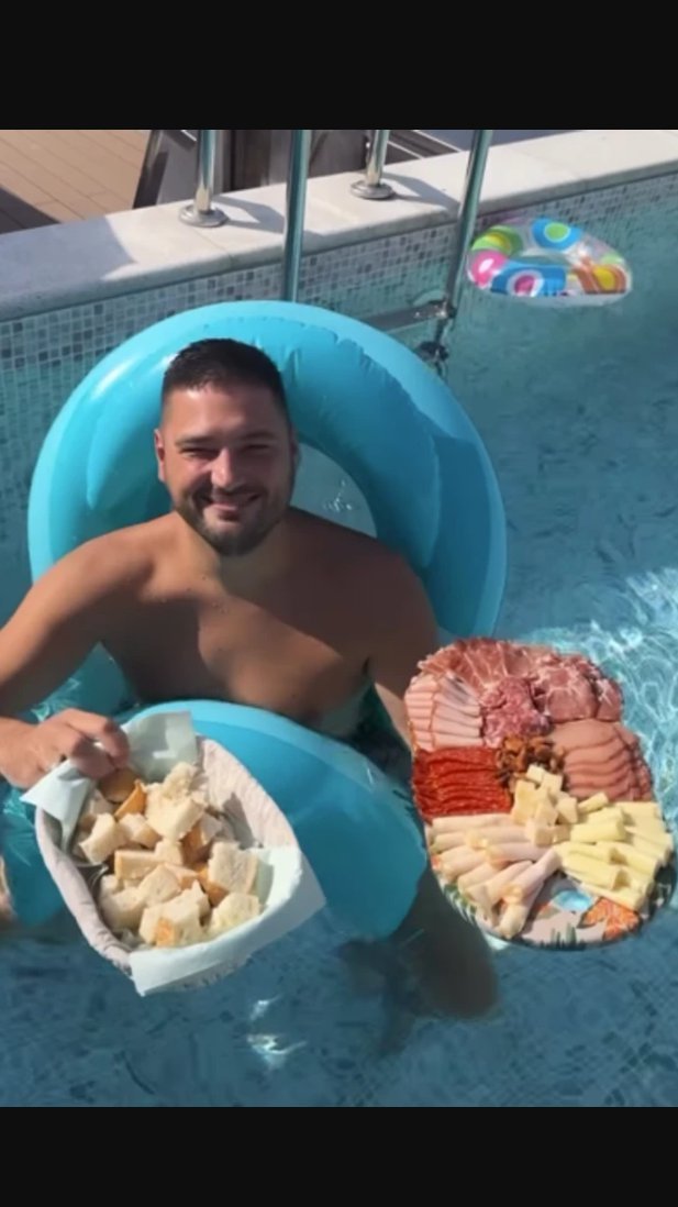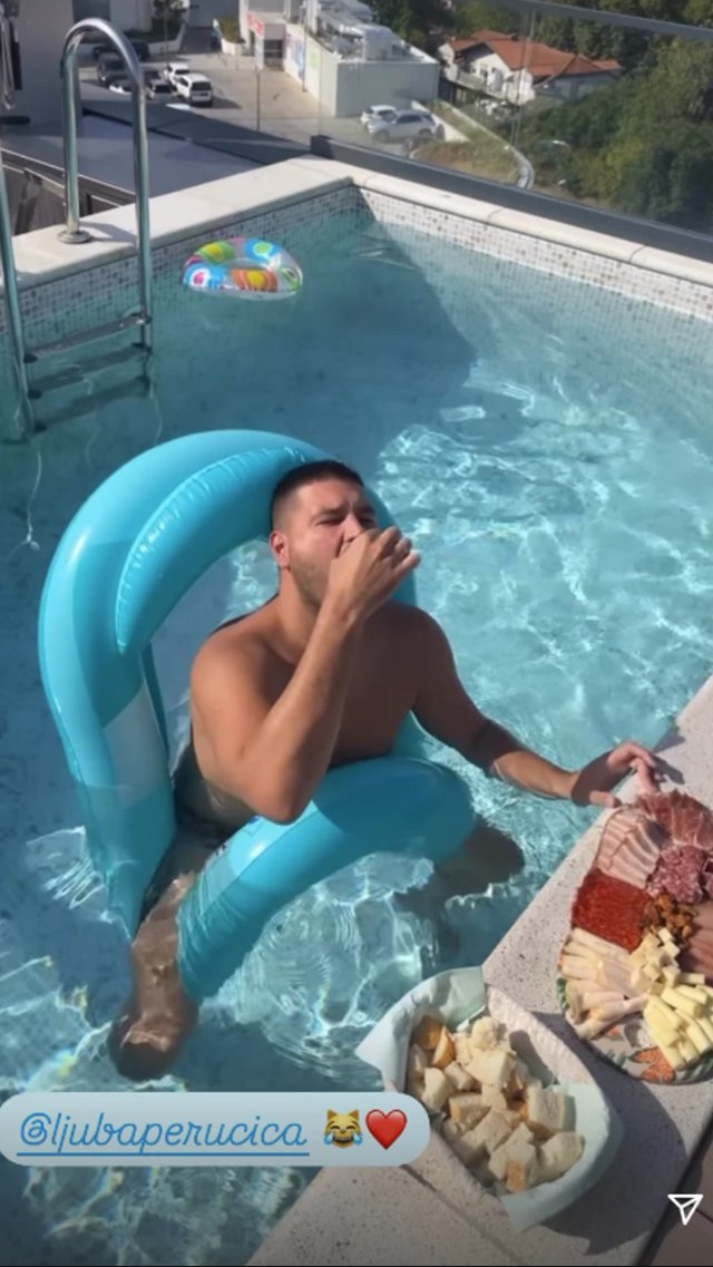 Ljuba je u bazenu uzeo dasku na kojoj je nasloženo predjelo, a u drugoj ruci je držao korpu sa hlebom.