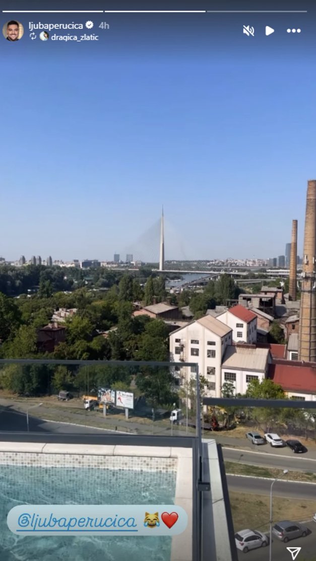 Ljuba se sa suprugom i koleginicom kupa u bazenu koji se nalazi na vrhu zgrade, a pored savršenog pogleda iz vode, ne nedostaje ništa, pa ni hrane.