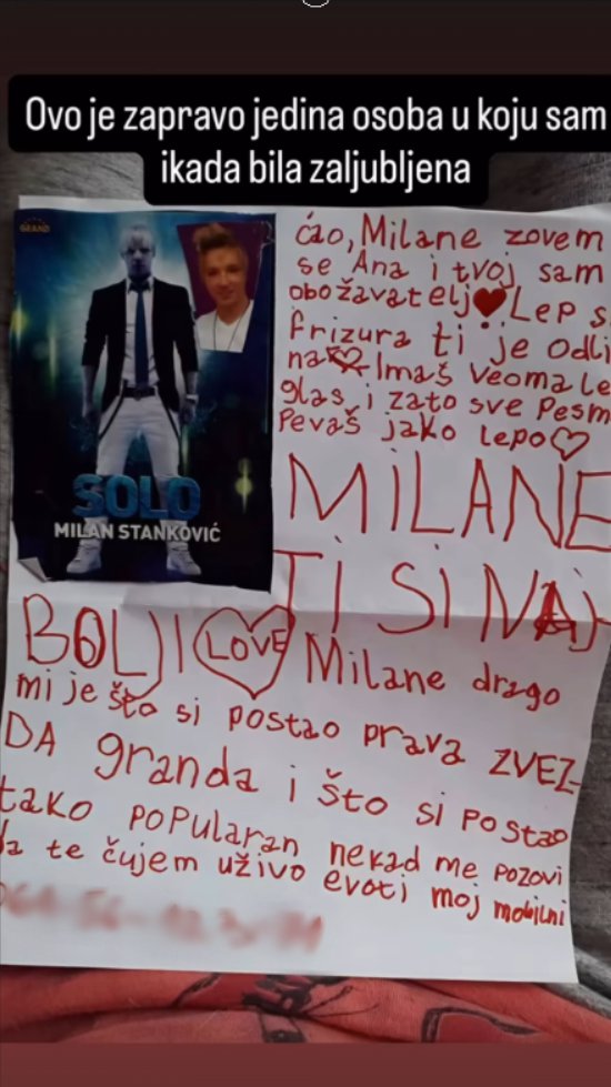 - Ćao Milane zovem se Ana i tvoj sam obožavatelj. Lep si, frizura ti je odlična. Imaš veoma lep glas i zato sve pesme pevaš jako lepo. Milane ti si najbolji, drago mi je što si postao prava Zvezda Granda i što si postao tako popularan. Nekad me pozovi da te čujem uživo, evo ti moj broj - pisalo je u pisamcetu.