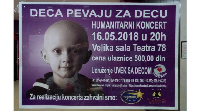 Udruženje "Uvek sa decom" u saradnji sa školom pevanja "Voice Stars Factory" organizovalo je veče za pamćenje. Mališani iz ove škole pevali su večeras u "Teatru 78" za najmlađe obolele od opake bolesti.
