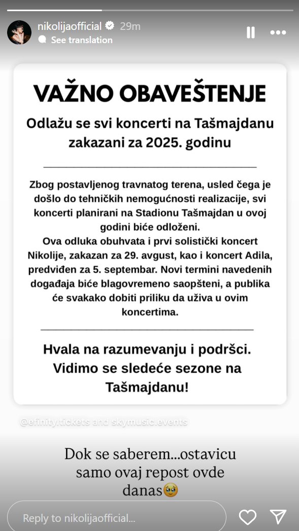 - Važno obaveštenje! Odlažu se svi koncerti na Tašmajdanu zakazani za 2025. godinu. Zbog postavljenog travnatog terena, usled čega je došlo do tehničkih nemogućnosti realizacije, svi koncerti planirani na Stadionu Tašmajdan u ovoj godini biće odloženi. Ova odluka obuhvata i prvi solistički koncert Nikolije, zakazan za 29. avgust kao i koncert Adila predviđen za 5. septembar. Novi termini biće blagovremeno saopšteni, a publika će svakako dobiti prilike da uživa u koncertima. Hvala na razumevanju i podršci vidimo se sledeće sezone - napisali su iz organizacije, a saopštenje je podelila i Nikolija uz reči: