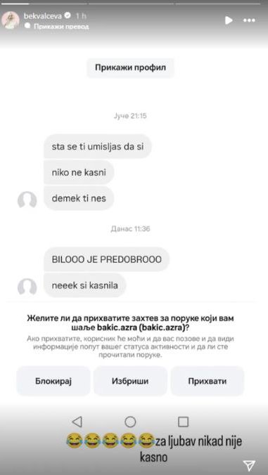 - Bilo je predobro, Neka si kasnila - napisala joj je ona u poruci na Instagramu.Ovu situaciju je Nataša podelila sa javnošću, a sve je opisala emotikonima koji opisuju osobu koja plače od smeha.