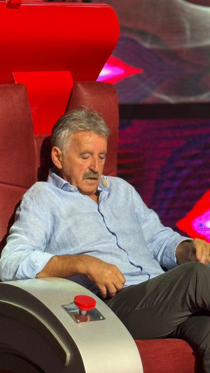 Dragan Stojković Bosanac stigalo je među prvima na snimanje, u plavoj košulji i odmah zauzeo mesto u čuvenoj crvenoj stolici.