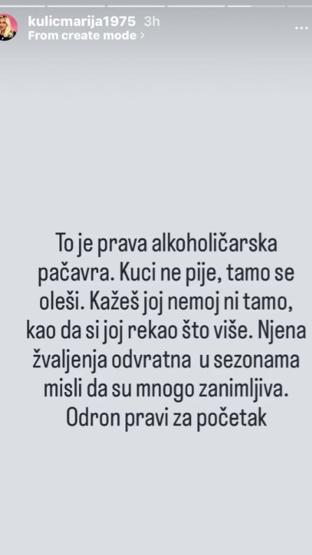 - To je prava alkoholičarka pačavra. Kući ne pije, tamo se oleši. Kažeš joj nemoj ni tamo, kao da si joj rekao što više. Njena žvljanjea odvratna u sezonama misli da su mnogo zanimljivija. Odron pravi za početak - napisala je Marija Kulić na svom Instagramu povodom lude žurke na kojoj se Miljana ludo zabavljala sa Filipom.