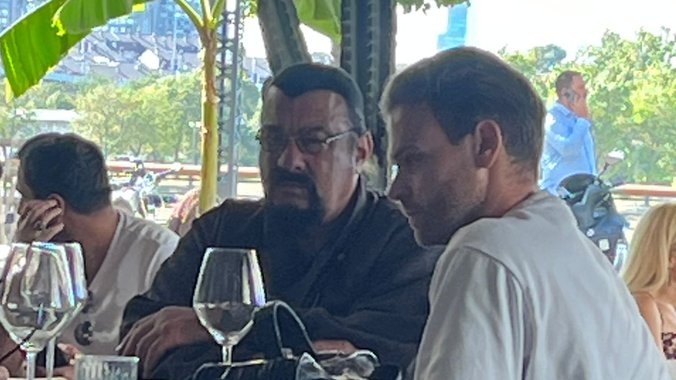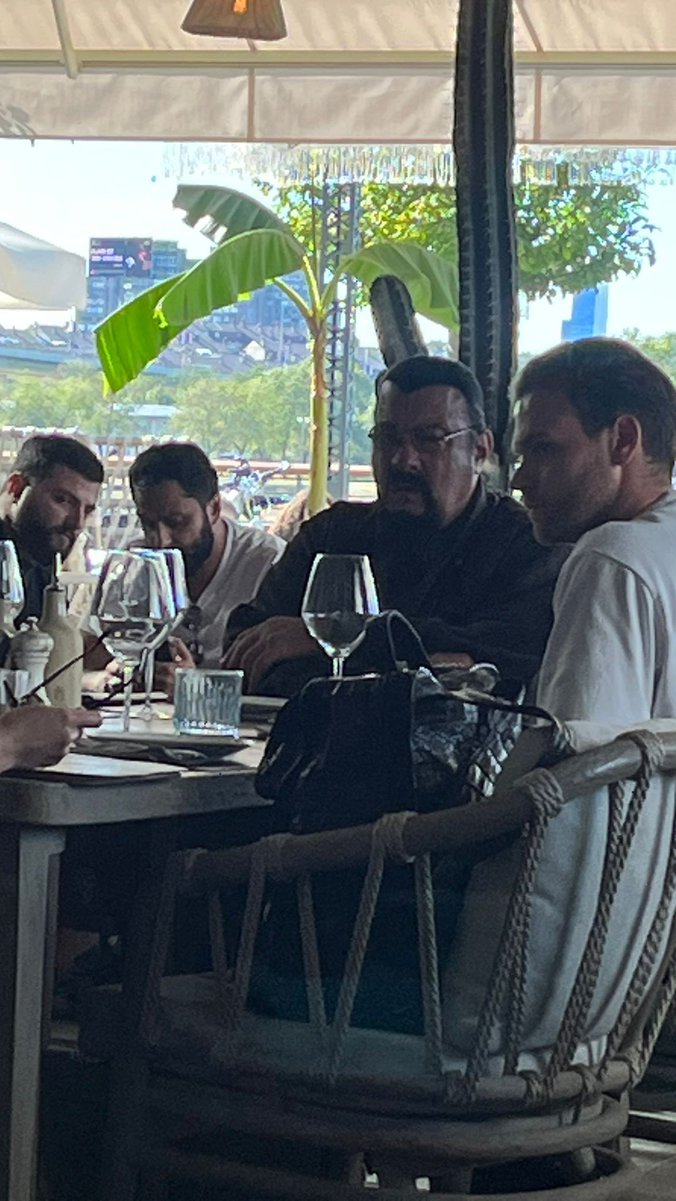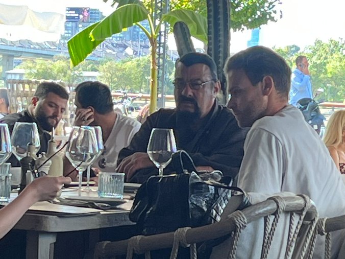U svom prepoznatljivom stilu, Stiven se trudio da ne privlači pažnju prisutnih, ali ga je ipak naš paparaco uslikao. On je u rastoranu ručao u ispijao vino, a ostalo je nejasno da li je ovo bio poslovni satanak pred novi akcioni triler koji Sigal snima u Beogradu ili neobavezan izlazak sa prijateljima.