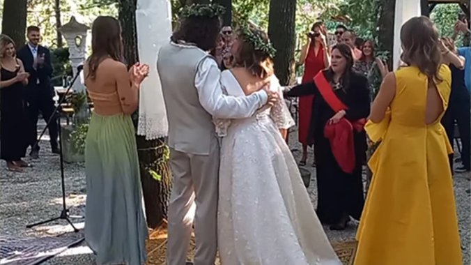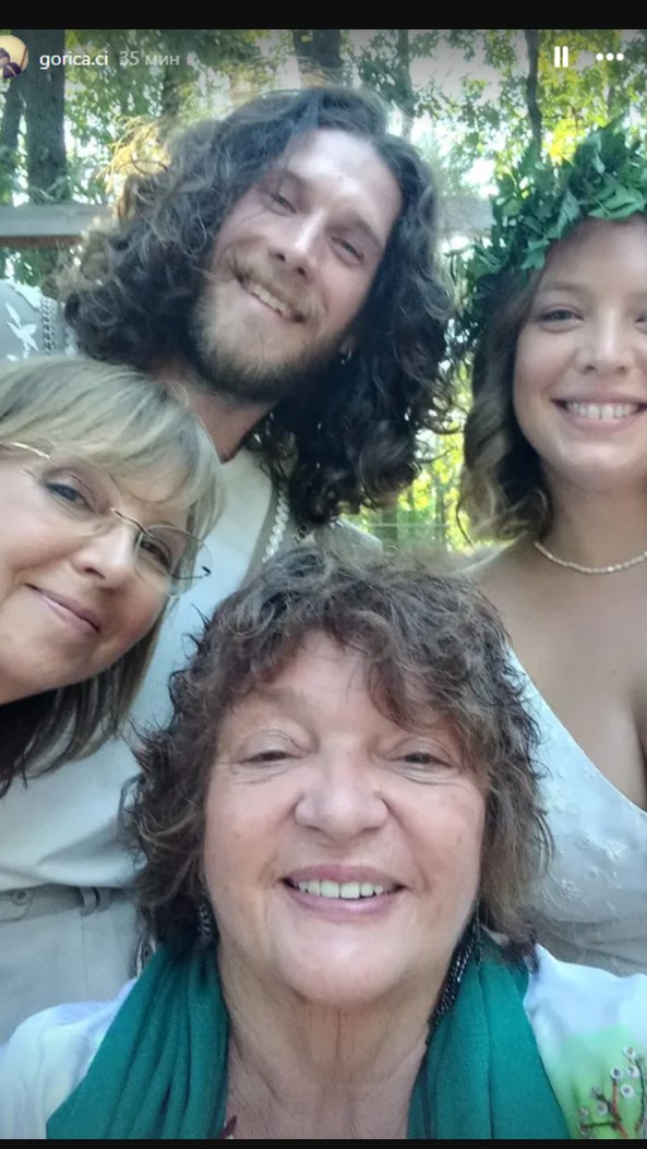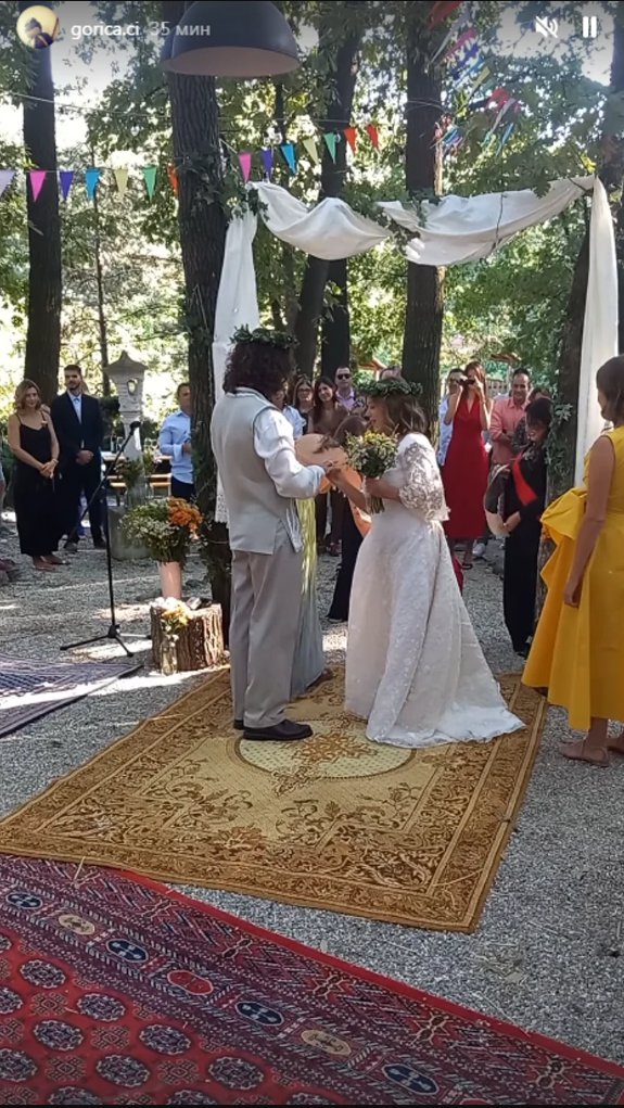 Mladenci su nosili venčiće na glavi, mlada je blistala u venčanici, dok je mladoženja imao belu košulju i preko nje sivi prsluk.Na društvenim mrežama Bilja nije delila snimke, ali su isplivali oni koje su delili gosti, a među njima je bila i glumica Gorica Popović.