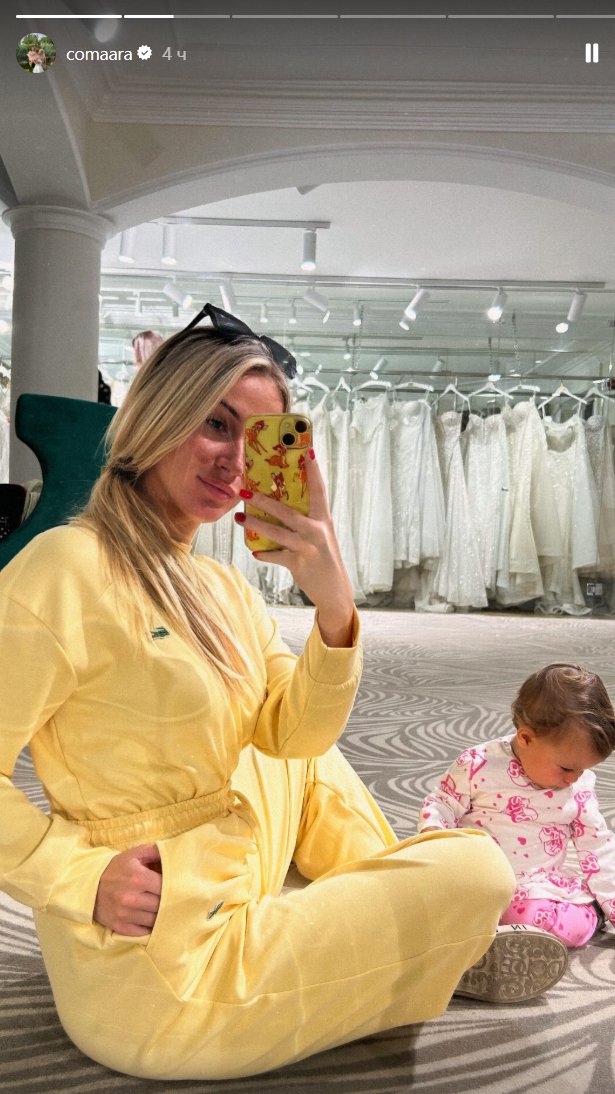 Ćerkica se igrala na podu, dok je Milica pozirala u trenerci, a iza nje se videlo mnoštvo modela različitih venčanica.