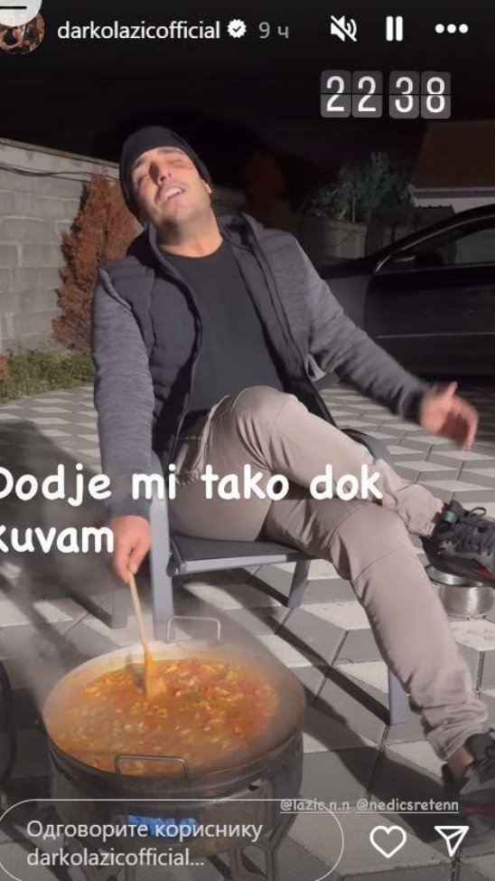 Folk pevač Darko Lazić pre nedelju dana imao je saobraćajku u Beogradu, kada se vraćao sa suprugom Katarinom sa jedne proslave.Lazić je nedugo zatim pokazao kako provodi vreme u svom domu.Darko Lazić večeras je seo u svoje dvorište u porodičnoj kući u Brestaču, upalio kotlić, a onda zapevao.