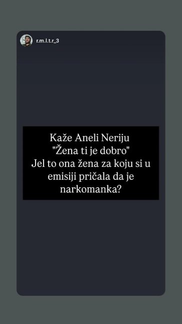 - Kaže Aneli Neriu: "Žena ti je dobro", je l' to ona žena za koju si u emisiji pričala da je narkomanka? - glasila je objava jednog profila na Instagramu.