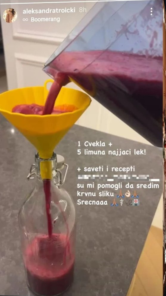 Aleksandra Troicki, supruga bivšeg tenisera Viktora Troickog, sa pratiocima na Instagramu podelila je recept za napitak koji joj je poboljšao krvnu sliku.