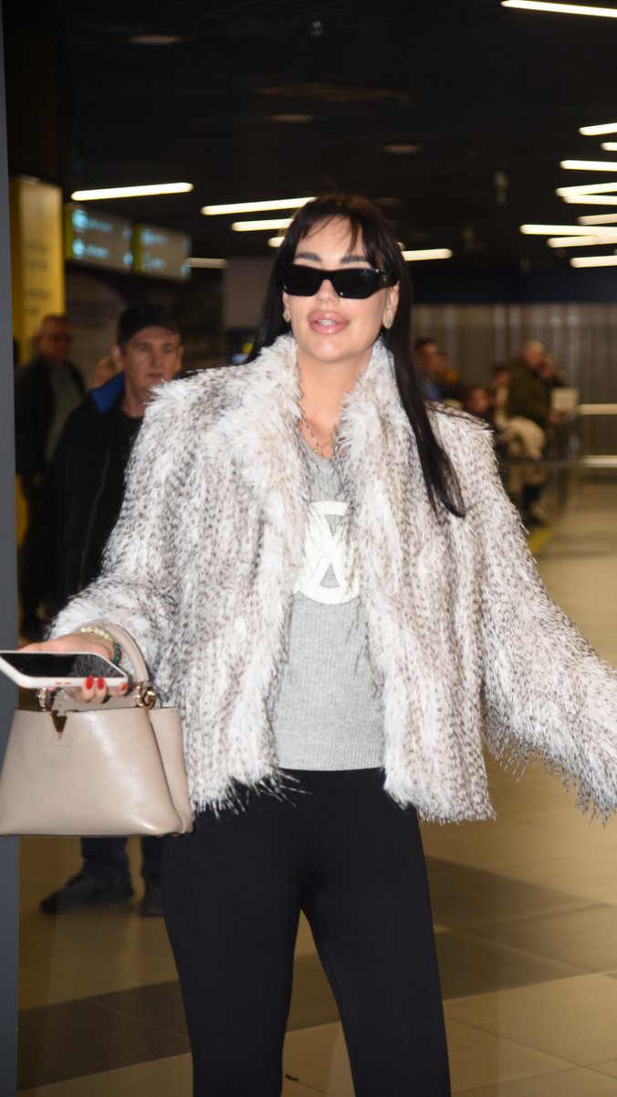 Na fotografijama se vidi kako pevačica, vidno raspoložena, izlazi iz terminala sa ručnim koferom i torbom u kojoj je, sudeći po prizoru, ponela samo neophodne stvari za put. Opuštenu kombinaciju činile su crne helanke, udobne bele patike i krznena jakna u sivim tonovima, dok je stajling upotpunila tamnim naočarima i bež torbom.