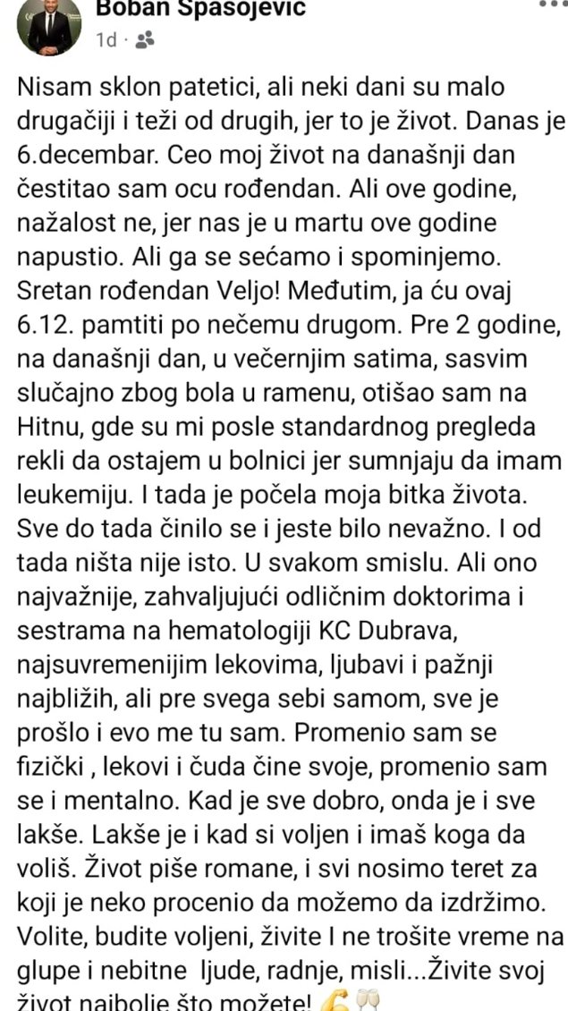 - Nisam sklon patetici, ali neki dani su malo drugačiji i teži od drugih, jer to je život. Danas je 6. decembar. Ceo moj život na današnji dan čestitao sam ocu rođendan. Ali ove godine, nažalost ne, jer nas je u martu ove godine napustio. Ali ga se sećamo i spominjemo. Sretan rođendan Veljo! Međutim, ja ću ovaj 6.12. pamtiti po nečemu drugom. Pre 2 godine, na današnji dan, u večernjim satima, sasvim slučajno zbog bola u ramenu, otišao sam na Hitnu, gde su mi posle standardnog pregleda rekli da ostajem u bolnici jer sumnjaju da imam leukemiju. I tada je počela moja bitka života. Sve do tada činilo se i jeste bilo nevažno. I od tada ništa nije isto. U svakom smislu. Ali ono najvažnije, zahvaljujući odličnim doktorima i sestrama na hematologiji KC Dubrava, najsavremenijim lekovima, ljubavi i pažnji najbližih, ali pre svega sebi samom, sve je prošlo i evo me tu sam. Promenio sam se fizički, lekovi i čuda čine svoje, promenio sam se i mentalno. Kad je sve dobro, onda je i sve lakše. Lakše je i kad si voljen i imaš koga da voliš. Život piše romane, i svi nosimo teret za koji je neko procenio da možemo da izdržimo. Volite, budite voljeni, živite i ne trošite vreme na glupe i nebitne ljude, radnje, misli… Živite svoj život najbolje što možete!