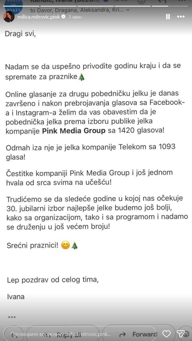 - Online glasanje za drugu pobedničku jelku je danas zavšerno i nakon prebrojavanja glasova sa Facebook-a i Instagram-a želim da vas obavestim da je pobednička jelka prema izboru publike jelka kompanije Pink Media Group sa 1420 glasova - pisalo je u poruci.