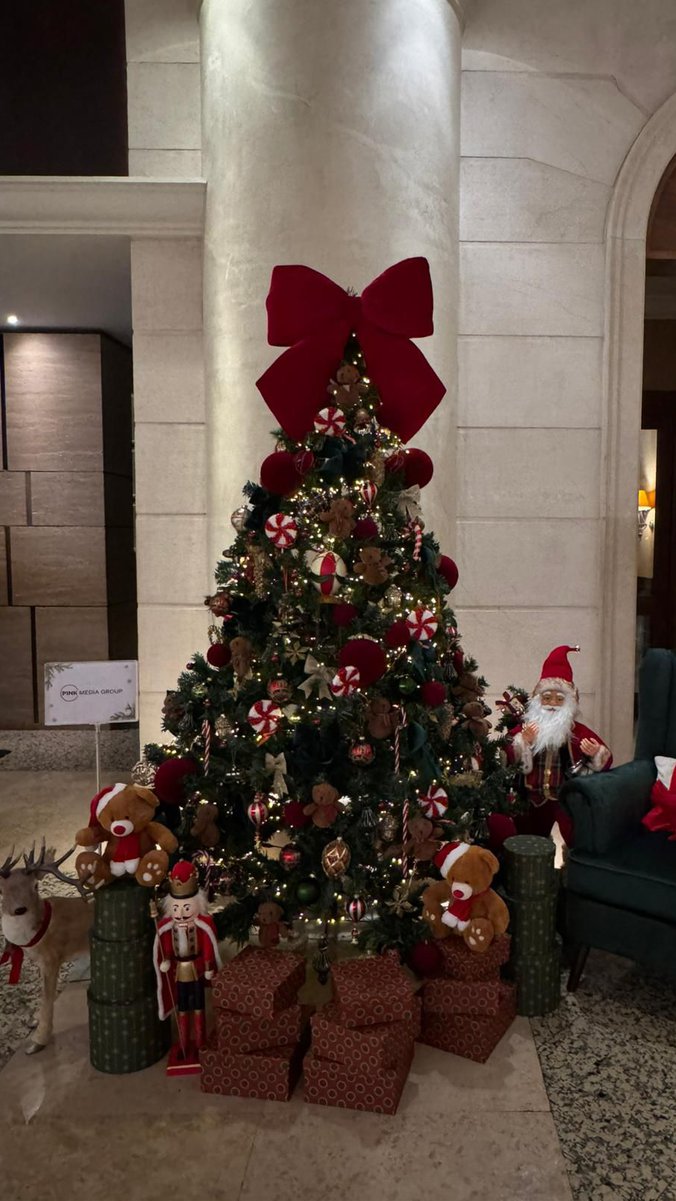 Naime, dekoracija na jelki ostavila je sve bez teksta, najviše ima crvene boje, od prazničnih ukrasa, do velike mašne na vrhu jelke, a pored ukrasa, nalaze se i male plišane mede.
