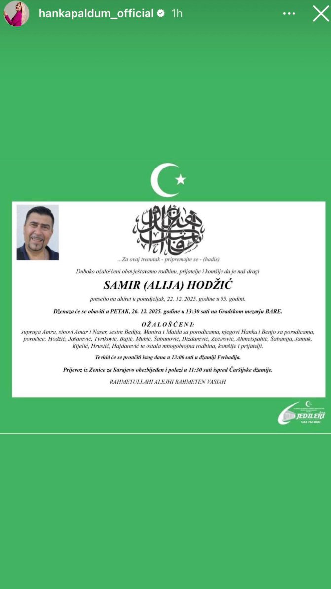 Hanka Paldum tek sada je smogla snagu da se oglasi, pa je na društvenoj mreži Instagram podelila snimak pokojnog kolege, ali i umrlicu sa datumom ispraćaja.