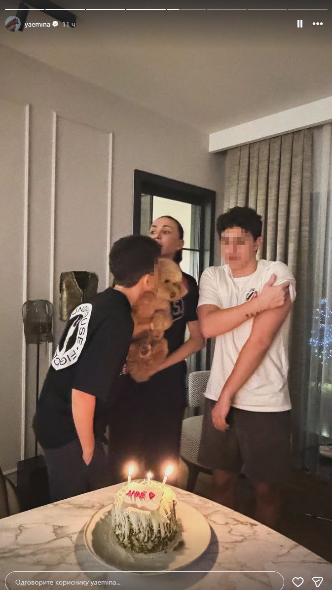 Na jednoj od slika, drži svog psa u naručju, dok su sinovi pored nje, a ispred njih torta sa upaljenim svećicama.