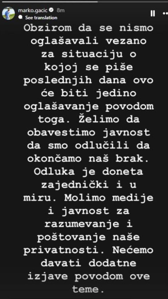- Obzirom da se nismo oglašavali vezano za situaciju o kojoj se piše poslednjih dana, ovo će biti jedino oglašavanje povodom toga. Želimo da obavestimo javnost da smo odlučili da okončamo naš brak. Odluka je doneta zajednički i u miru. Molimo medije i javnost za razumevanje i poštovanje naše privatnosti. Nećemo davati dodatne izjave povodom ove teme - napisao je Marko Gačić.