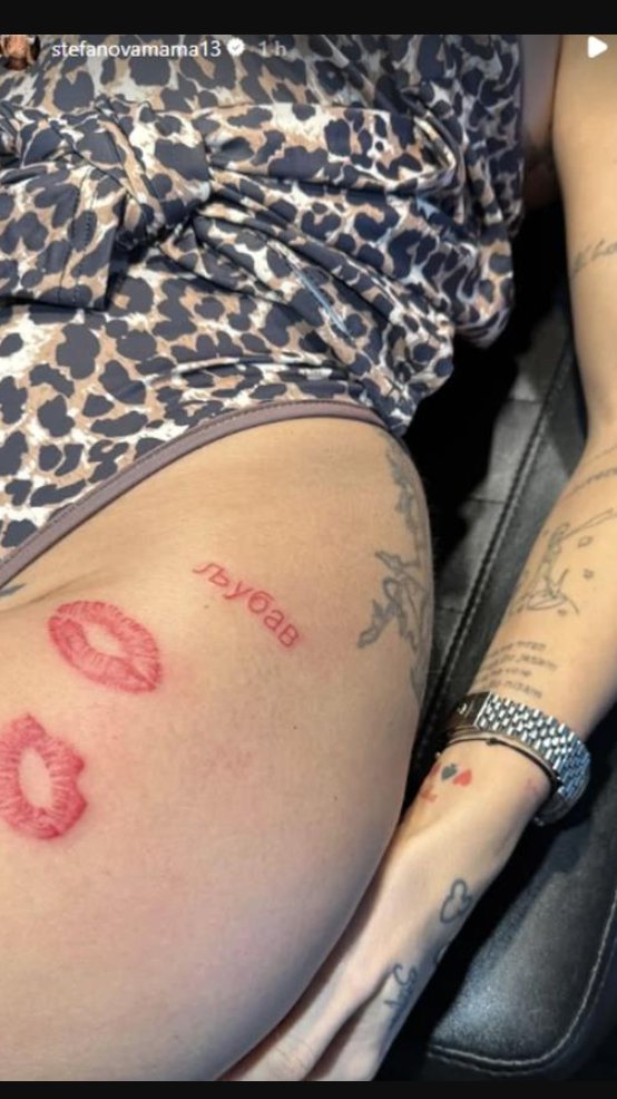 Milica je istetovirala gornji deo butine crvenom bojom, a pored dva otiska usana, tu je i reč „ljubav“ napisana na ćirilici.