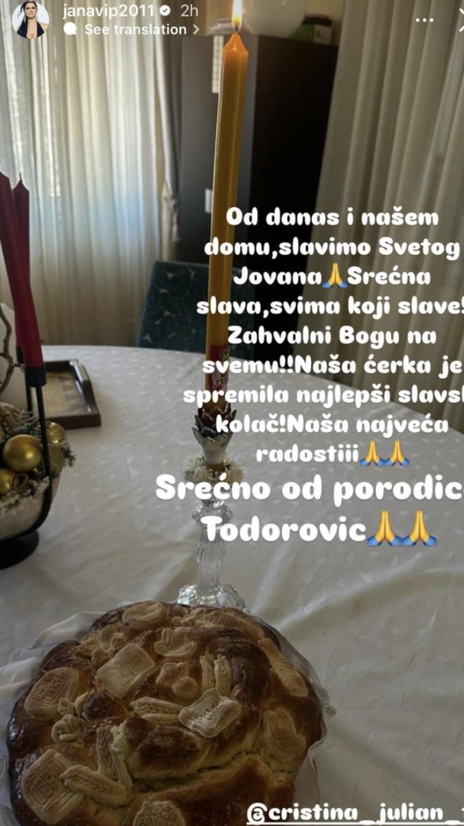 - Od danas u našem domu slavimo Svetog Jovana. Srećna slava svima koji slave. Zahvalni Bogu na svemu, naša ćerka je spremila najlepši slavski kolač. Naša najveća radosti! Srećno od porodice Todorović - poručila je Jana i tagovala ćerku Kristinu.