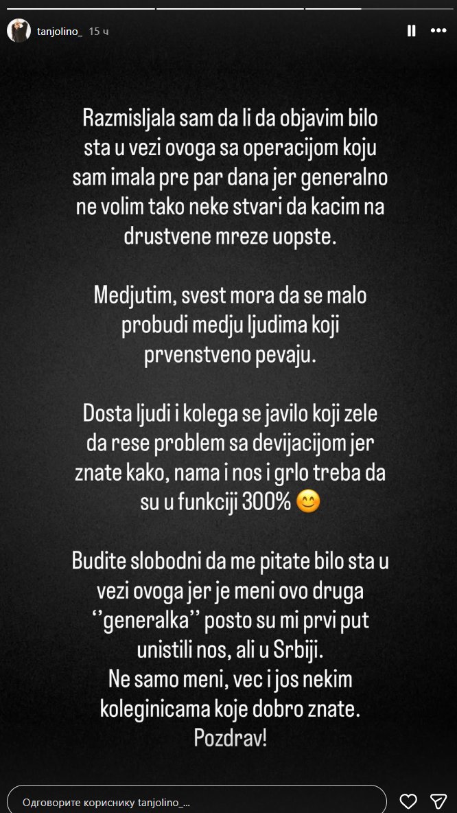 - Razmišljala sam da li da objavim bilo šta u vezi ovoga sa operacijom koju sam imala pre par dana jer generalno ne volim tako neke stvari da kačim na društvene mreže uopšte. Međutim, svest mora da se malo probudi među ljudima koji prvenstveno pevaju. Dosta ljudi i kolega se javilo koji žele da reše problem sa devijacijom jer znate kako, nama i nos i grlo treba da su u funkciji 300% - napisala je pevačica, pa nastavila: