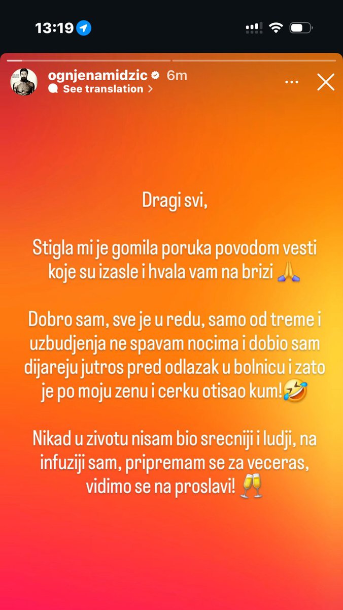 - Dragi svi, stigla mi je gomila poruka povodom vesti koje su izašle i hvala vam na brizi. Dobro sam, sve je u redu, samo od treme i uzbuđenja ne spavam noćima i dobio sam dijareju jutros pred odlazak u bolnicu i zato je po moju ženu i ćerku otišao kum. Nikad u životu nisam bio srećniji i luđi, na infuziji sam, pripremam se za večeras, vidimo se na proslavi - poručio je Ognjen.