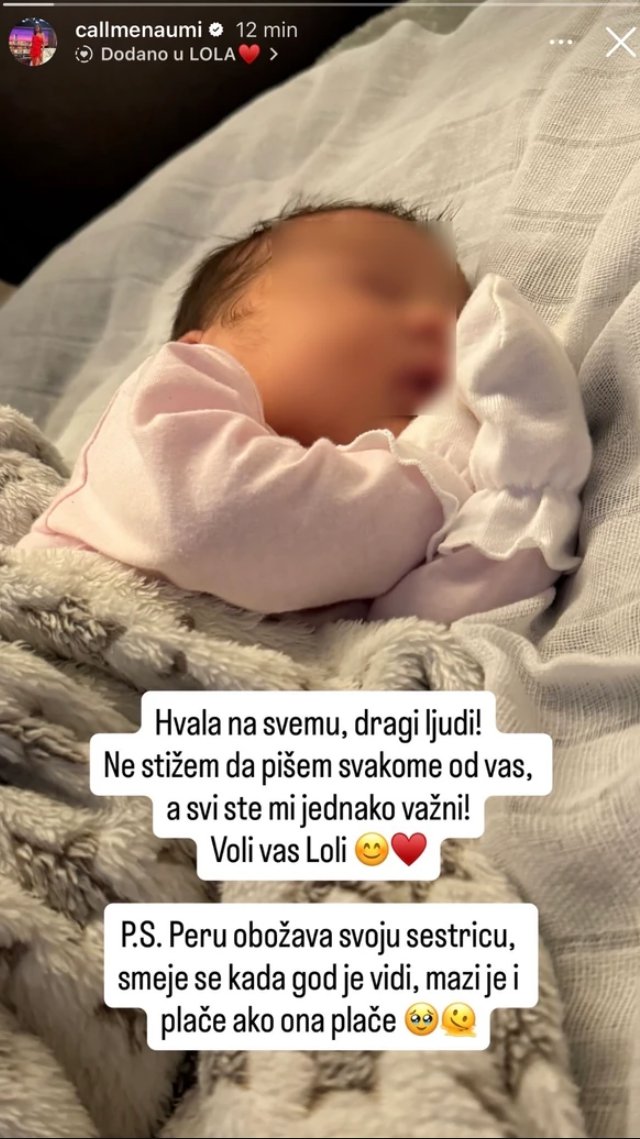 - Hvala na svemu dragi ljudi. Ne stižem da pišem svakome od vas, a svi ste mi jednako važni Voli vas Loli. P.S. Perun obožava svoju sestricu, smeje se kada god je vidi, mazi je i plače ako ona plače - napisala je ona.