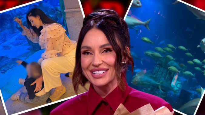 Pevačica je čučnula pored sina i nežno ga pridržavala, dok mu je rukom pokazivala ribe iza ogromnog stakla, potpuno posvećena njegovom doživljaju i radoznalom pogledu.