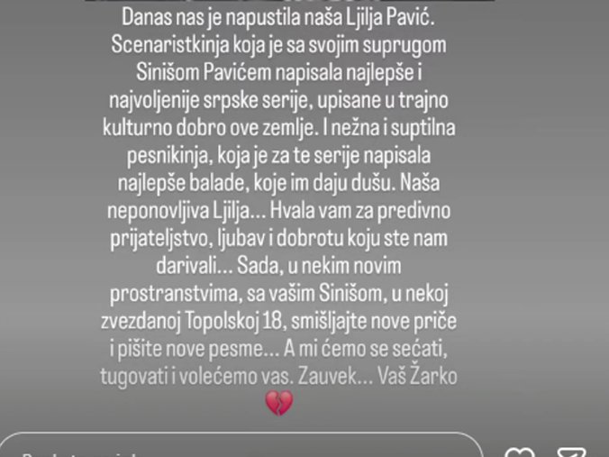 - Danas nas je napustila naša Ljiilja Pavić. Scenaristkinja koja je sa svojim suprugom Sinišom Pavićem napisala najlepše i najvoljenije srpske serije, upisane u trajno kulturno dobro ove zemlje. I nežna i suptilna pesnikinja, koja je za te serije napisala najlepše balade, koje im daju dušu. naša neponovljiva Ljilja... Hvala vam za predivno prijateljstvo, ljubav i dobrotu koji ste nam darivali... sada, u nekim novim prostranstvima, sa vašim Sinišom, u nekoj zvezdanoj topolskoj 18, smišljajte nove priče i pišite nove pesme... a mi ćemo se sećati, tugovati i voleti vas. zauvek... Vaš Žarko.