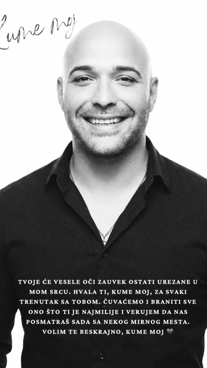 - Tvoje će vesele oči zauvek ostati urezane u mom srcu. Hvala ti, kume moj, za svaki trenutak sa tobom. Čuvaćemo i braniti sve ovo što ti je najmilije i verujem da nas posmatraš sada sa nekog mirnog mesta. Volim te beskrajno, kume, moj - pisalo je u objavi potresene pevačice.