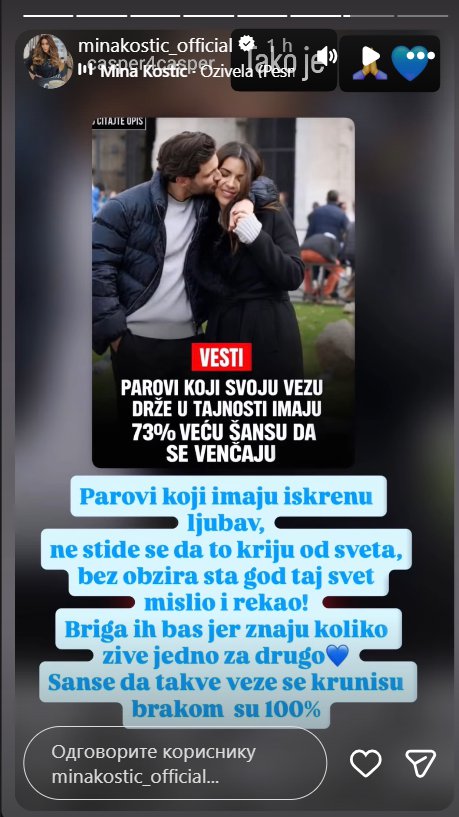 O njihovoj vezi nedeljama je brujala domaća jasvnost, a glavna su tema bili i na društvenim mrežama. Ljubavni par našao se na meti pojedinih osuda i podsmeha jer je sve krenulo na društvenim mrežama, međutim njih dvoje nisu poklekli, već bivali sve jači, o čemu svedoči i Minina današnja objava.