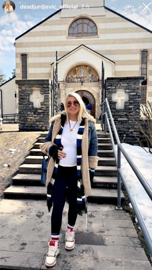 Na slici Dea pozira ispred crkve, obučena u opuštenu sportsku kombinaciju – crne pantalone, belu majicu i patike, dok je preko svega ponela toplu jaknu i dugačak šal. Ono što svima odmah upada u oči jeste njen osmeh, ali i nežan gest – rukom drži stomak, nagoveštavajući srećne dane koje iščekuje.