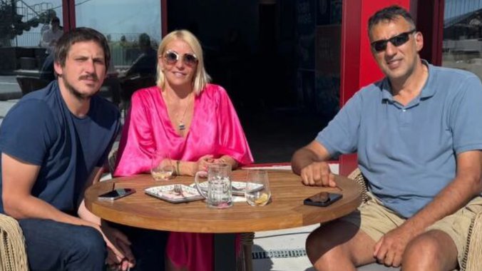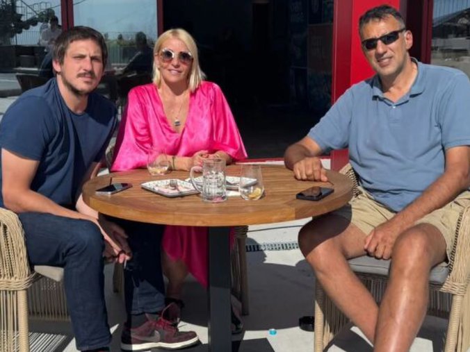 Na fotografiji, Matija sedi levo u tamnoj majici. U sredini je Ana u upečatljivoj ružičastoj haljini, dok je Vlade desno, opušteno obučen u plavu polo majicu i bermude.