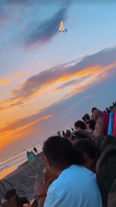 Pevačica je sa porodicom opuštala se na plaži uz zalazak sunca a na stočiću svež zeleni kokos sa slamčicom, raznobojni osvežavajući kokteli, šoljica kafe, kao i tanjir sa hranom i voćem.