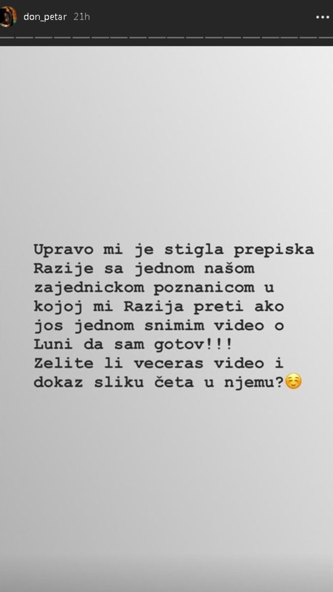 Pošto vidim da se međusobno pratiš sa onim "Don" Petrom. Prenesi mu ali suptilno, nemoj nikako da kažeš da je od mene poteklo, da ako još jednom bude snimio video ili spomenuo Lunu da će naje*ati. Ali ozbiljno! Prebiće ga neko, i molim te suptilno - napisala je blogerkina majka u poruci.