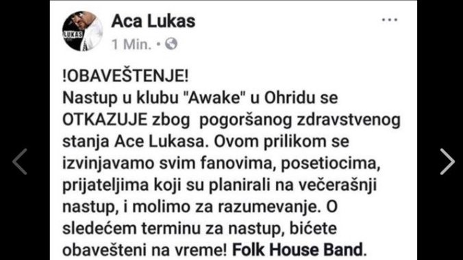 Nastup u Ohridu se otkazuje zbog pogoršanog zdravstvenog stanja Ace Lukasa. Ovom prilikom se izvinjavamo svim posetiocima, prijateljima koji su planirali nastup i molimo za razumevanje - pisalo je u obaveštenju.
