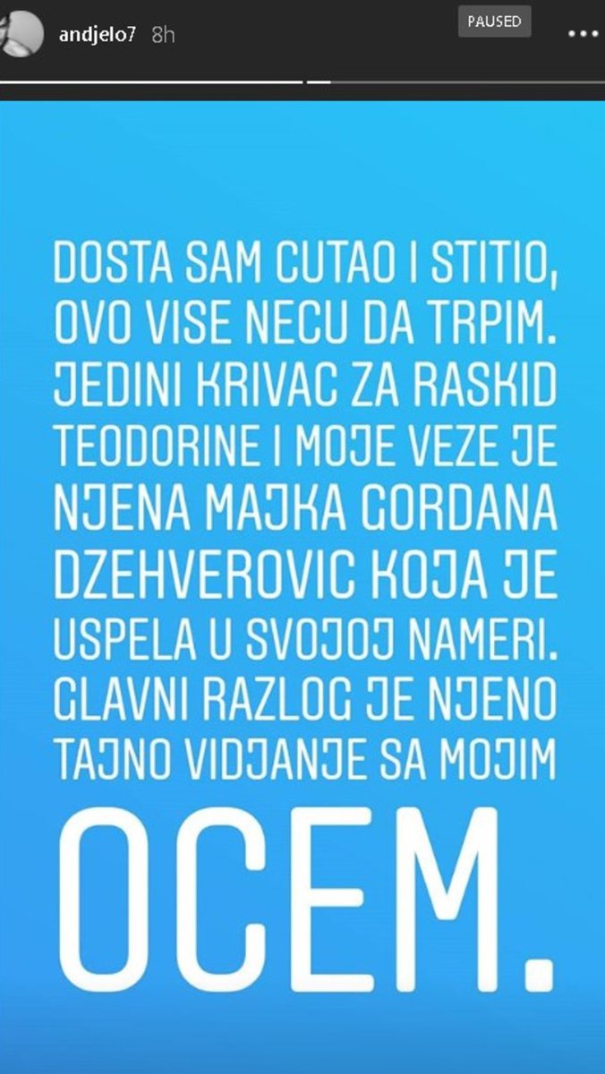 Dosta sam ćutao i štitio, ovo više neću da trpim. Jedini krivac za raskid Teodorine i moje veze je njena majka Gordana Džehverović koja je uspela u svojoj nameri. Glavni razlog je njeno tajno viđanje sa mojim ocem - napisao je Ranković na Instagramu.