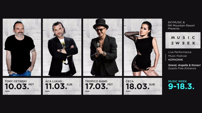 Poznato je da je Kopaonik jedno od omiljenih skijališta kod zvezda sa domaće javne scene, pa će sasvim sigurno mnogi od njih svoj odmor provesti upravo na ovoj planini. U okviru Music week festivala, od 9. do 18. marta 2017. očekuju nas četiri velika koncerta Svetlane Cece Ražnatović, Tonija Cetinskog, Ace Lukasa i Tropiko benda.