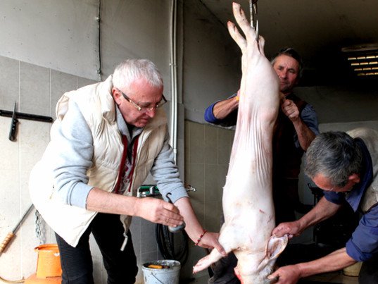 Kako su u toku pripreme za novogodišnju noć, Era je objasnio da se u njegovom restoranu priprema domaća hrana, a mi smo na njegovo imanje stigli baš u trenutku kada su klali svinje.