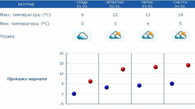 U Beogradu se očekuje pretežno oblačno i toplije, povremeno slaba kisa, koja će se u pojedinim delovima grada ujutru lediti na tlu. Vetar slab i umeren, juzni i jugoistočni, još ujutru povremeno jak. Najniža temperatura oko nula, najviše dnevna oko šest stepeni Celzijusa.