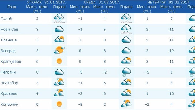 Temperatura će se kretati od minus osam do osam stepeni Celzijusa.